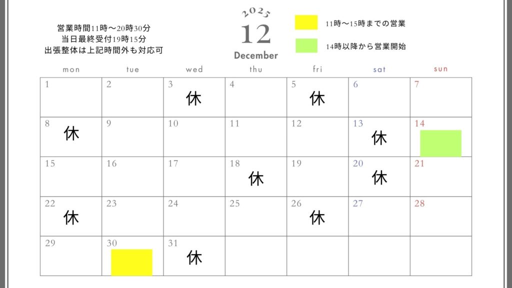 八王子の整体院「つきいち整体」の 営業日・営業時間・出張予定 をこちらでご確認いただけます。